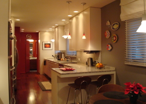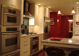 The flush overlay Kitchen cabinets have been painted white, the counter tops are a grey peppered granite and the Kitchen and Breakfast Area wall color is a medium warm grey. The red accent wall color at the far end of the Kitchen provides interest and further breaks up the length of the 30 foot galley Kitchen. The lighting in the Kitchen was modified to highlight the face of the upper cabinets. Under cabinet lights were included to enhance counter top tasks and illuminate the backsplash. Pendant lights were carefully placed over the two sinks and over the Breakfast Area peninsula to light tasks as well as to add visual interest in the long Kitchen. The Owners no longer think of the Kitchen as being unusually long; it is now a well-designed place to do laundry, prepare food and entertain.