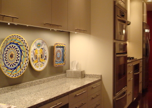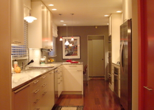 We removed all the existing cabinets, appliances, and heavy-handed soffits over the wall cabinets. We broke up the bowling alley effect of the 30 foot long kitchen with a short peninsula counter that doubles as a breakfast bar on the Desk/Breakfast table end of the space. The wall and base cabinets at the far end of the Kitchen were converted to full height pull-out pantry units on the interior wall.