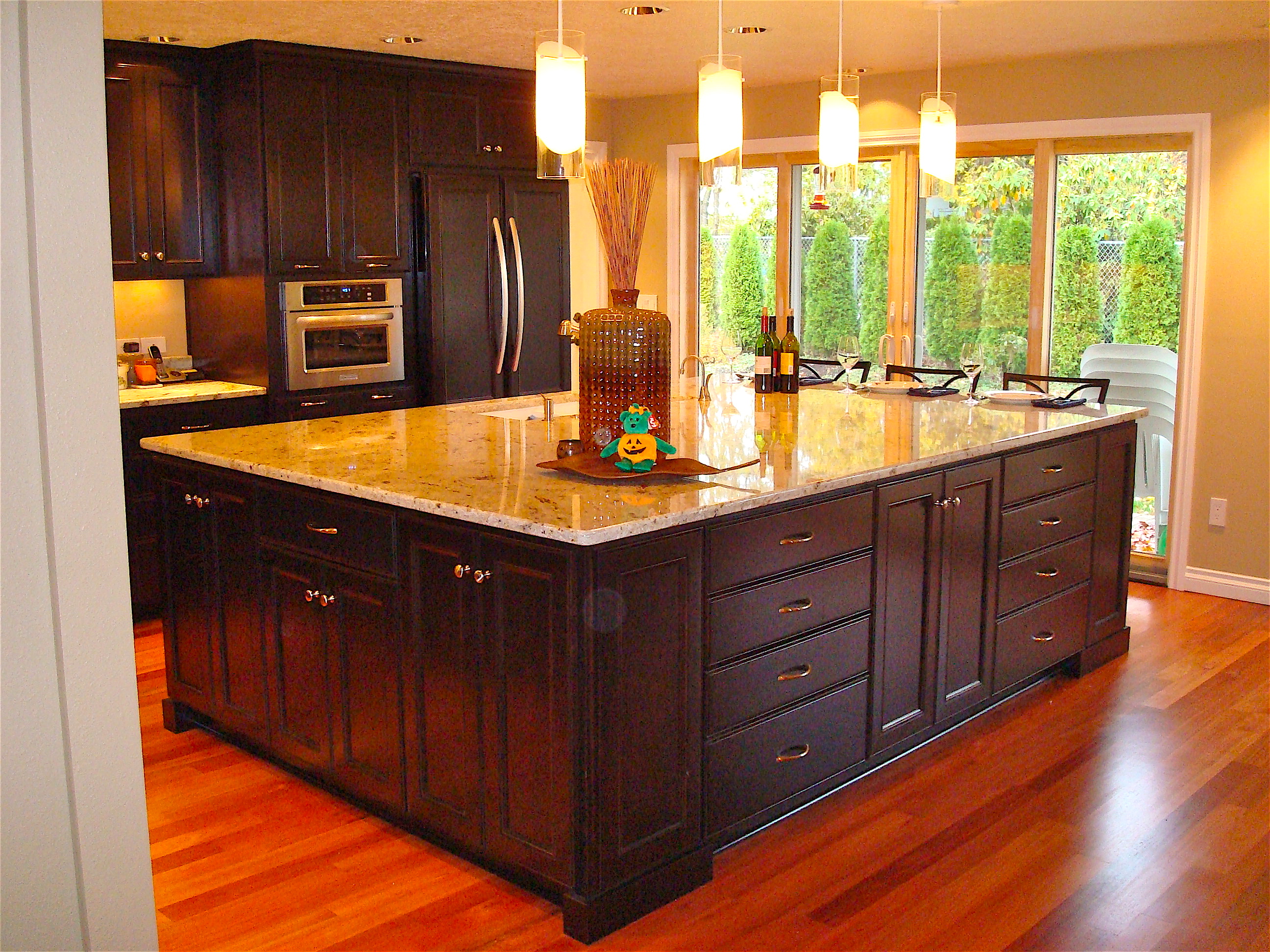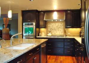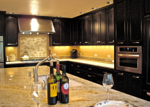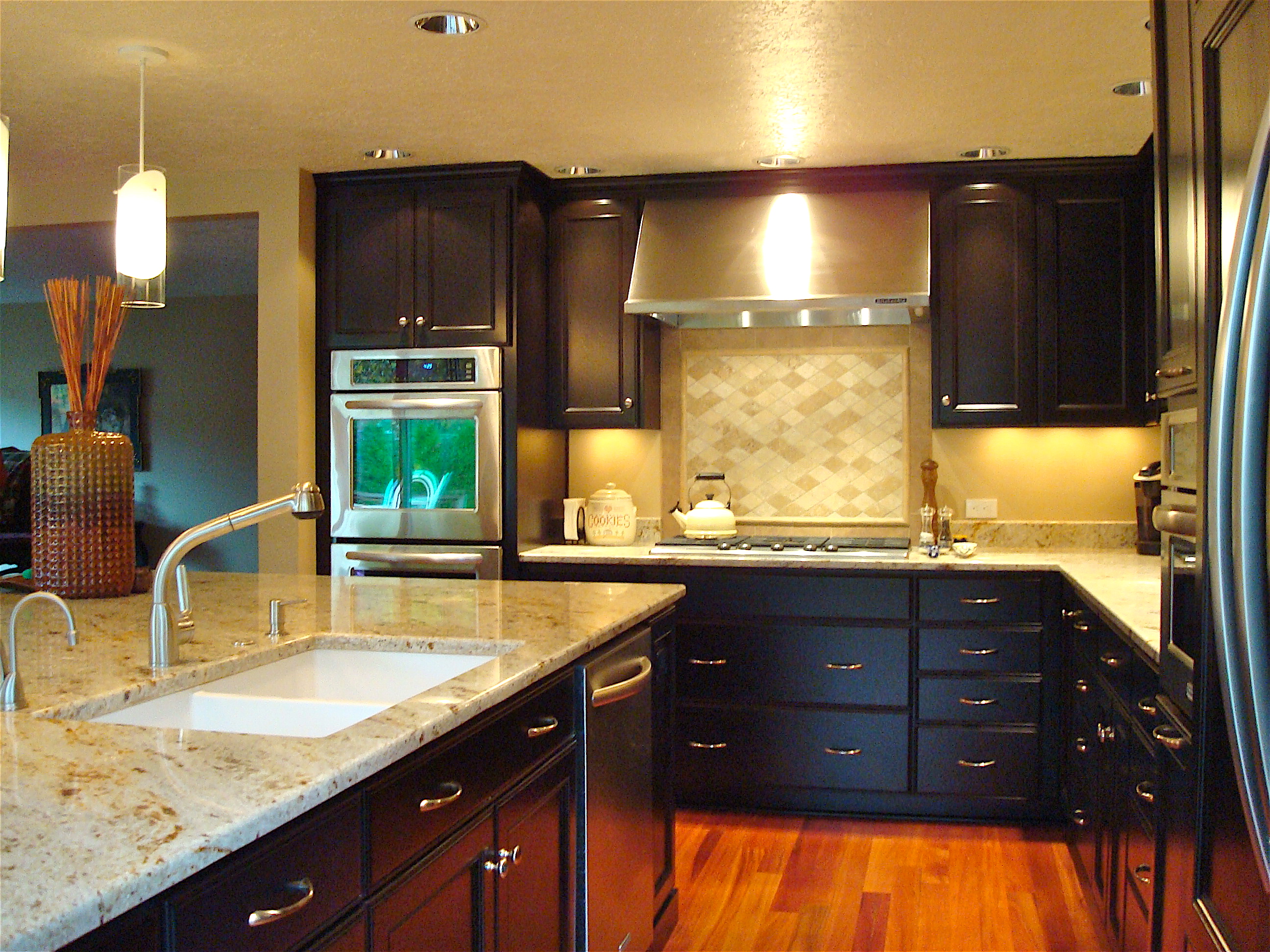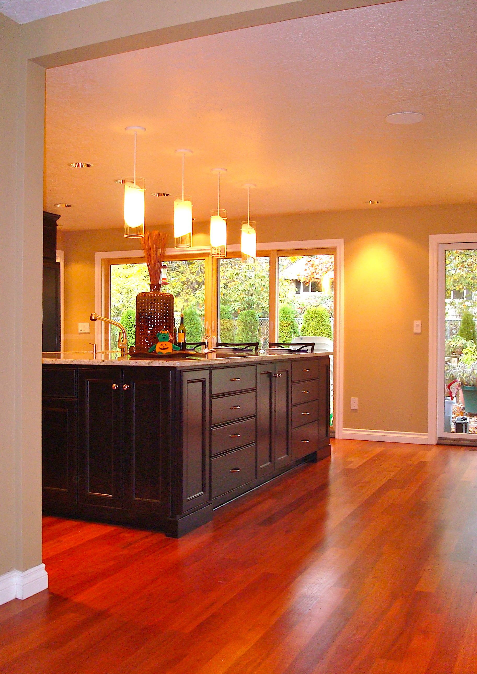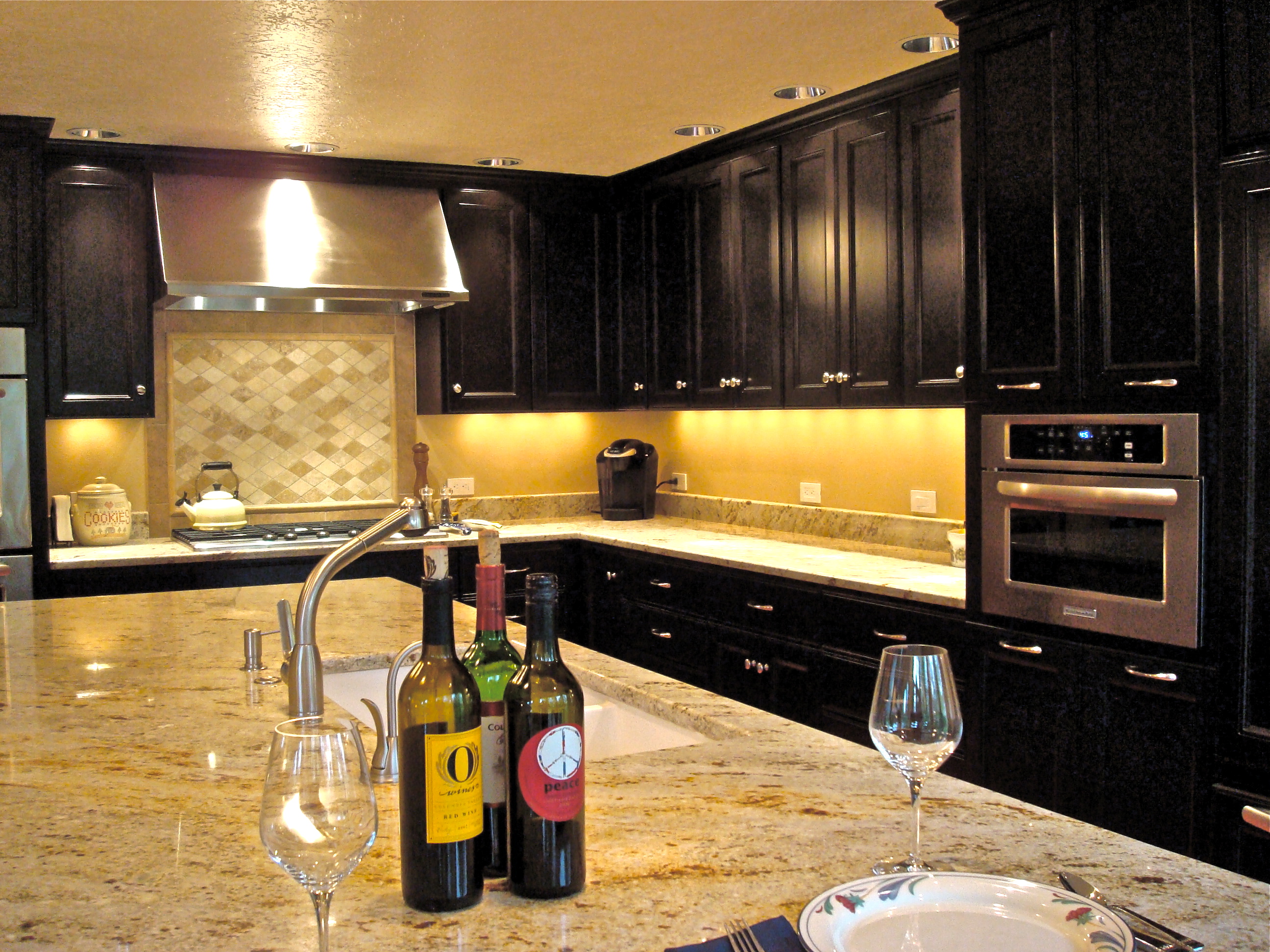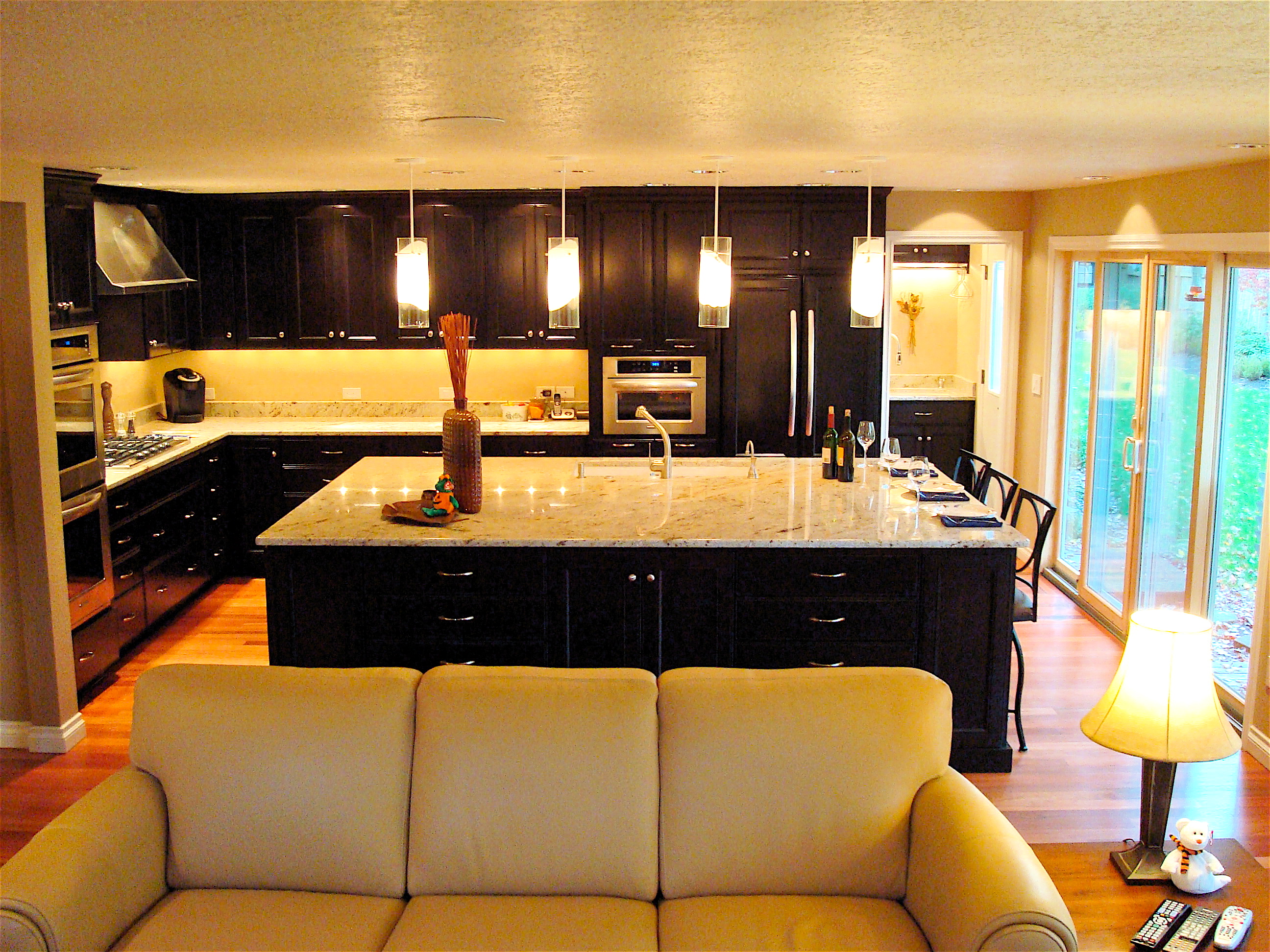 The dramatic dark casework and floor in the Kitchen and Family Room is balanced with the light neutral toned granite counter tops, fireplace surround and hearth. New 9-1/2 foot wide sliding glass doors replaced a 9 foot wide window in the former Breakfast Room. The new doors echo the existing doors from the Family Room to the Terrace.