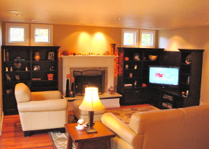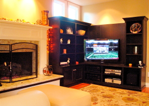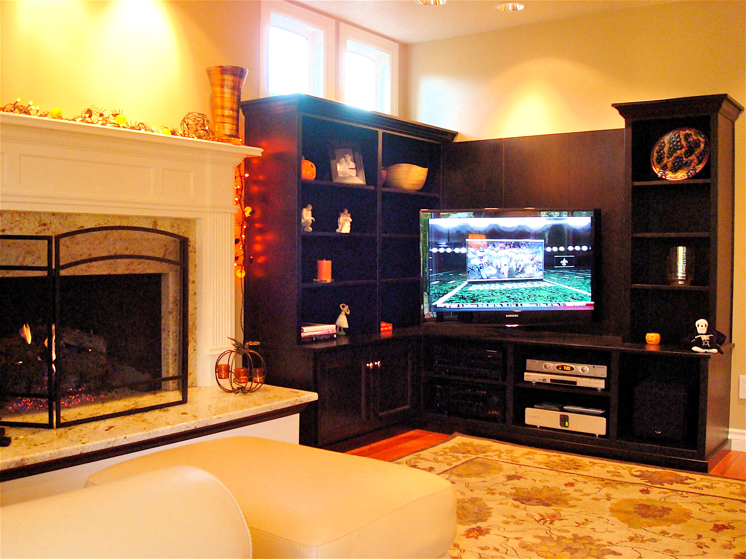 The dark casework in the Family Room does an excellent job obscuring the flat screen TV when it is not being watched. The TV is mounted on an arm that allows it to rotate to a 45-degree angle for viewing from the Family Room seating and Kitchen.