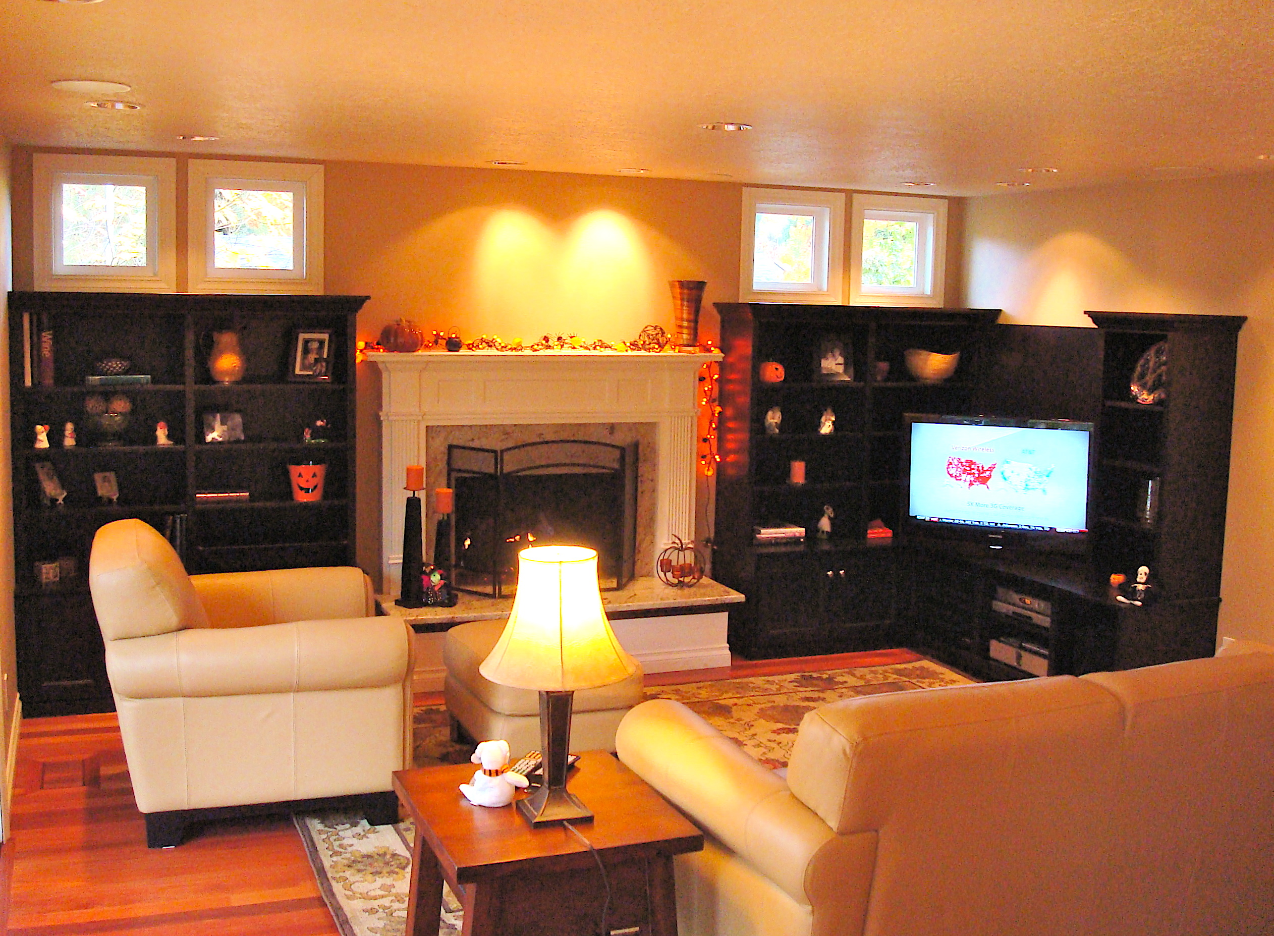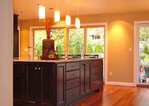 New high windows on each side of the fireplace provide welcome daylight to that end of the room while preserving privacy from the neighborhood street beyond. The recessed lighting in both rooms illuminates the walls, casework and work areas. The Owners are very pleased with the new expanded space, the increased access to the Terrace and the integration of the Kitchen with the Family Room.